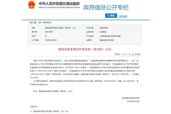 在2019年12月30日下达的《道路运输车辆达标车型表》(第16批)公示中有8款国六挖机平板运输车的安全运营试验通过技术审查,这8款分别是1款大运牌、1款程力威牌、2款东风牌、1款大力牌、1款新东日牌、1款南骏牌和1款福德牌。这几款国六挖机平板运输车当中只有大运牌平板运输车是国六车型。