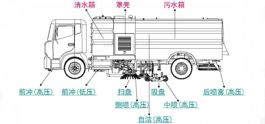 3、吸盘内有喷水降尘装置,喷嘴布置在吸盘内部,能大限度减少扬尘。左右喷水支架安装在扫盘上,随扫盘升降,结构简单紧凑,保证喷水支架达到佳的降尘效果。