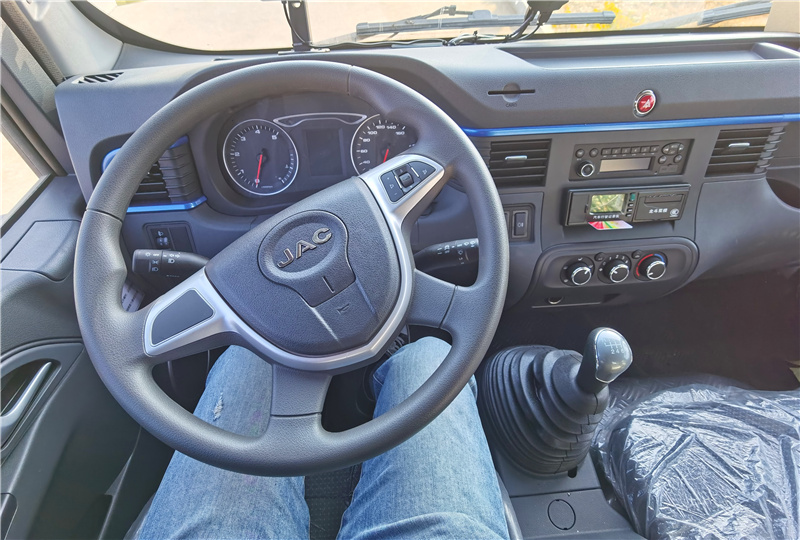 采用江淮高端骏铃V5驾驶室,单排1900mm宽体3人座,3365mm轴距,潍柴动力WP2.3NQ130E61(130马力),星锐六档变速箱,断气刹,7.00R16钢丝轮胎,液压方向助力,气推离合助力,OBD接口,框架式后视镜,MP3收放机,LED日间行车灯,电动车窗、中控锁,多功能方向盘,电加热后视镜,可调节方向盘,方向盘带娱乐功能、定速巡航功能,大灯调节,天窗通风口,多功能鹰眼仪表,语音提醒功能,发动机燃油预热,底盘故障自动检测功能,镀铝锌板100L油箱,暖风,原厂空调,自动调整臂,底盘线束预留PTO、远程油门线束接口,电磁式电源总开关,排气**制动,前盘,限速,ABS,行车记录仪,轮胎防爆装置,刹车片报**装置,危化品专用底盘。